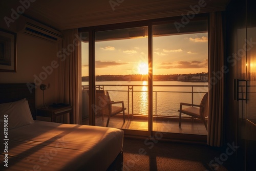 © nsit0108, Obraz premium Hotel room sunset. Generate Ai