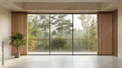 © Caterpillar, Obraz premium Hotel with balcony and forest view. Beige concrete room with terrace and nature landscape view. Modern villa architecture design for vacation and travel.