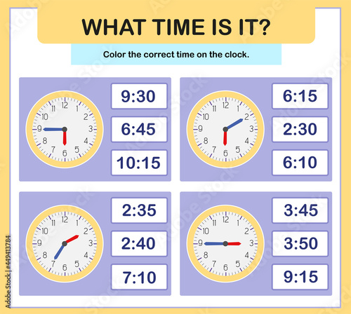 Naklejka premium 24 hour learning time. Educational activities worksheet for preschool. At the hour and a half hour, learning the clock, what time is it