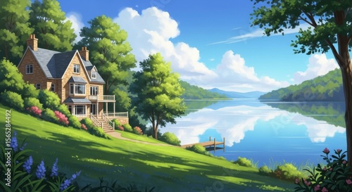 © Siti, Fototapeta premium House by Lake with Reflections, Green Lawn and Trees on a Sunny Day
