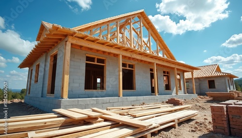 © Viktor, Obraz premium House construction site wooden beams framing structure. Concrete blocks, timber planks arranged neatly reflect busy work progress. Blue skies with clouds overhead provide backdrop for residential