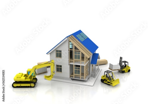 © LIORIKI, Obraz premium House 3d rendering illustration with open interior on top. Blueprints, documents, crane and mortgage calculations.