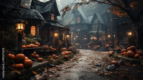 © zahra, Obraz premium House decorated for Halloween with pumpkins and webs, witches and ghosts