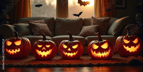 Fototapeta premium House decorated with spooky Halloween decorations, pumpkin faces and bats,...