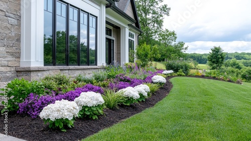 Obraz premium House exterior, landscaped garden, hillside view, summer