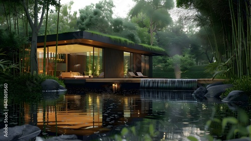 © XtzStudio, Fototapeta premium House in a cool and lush tropical forest, small lake in front, surrounded by bamboo trees and greenery
