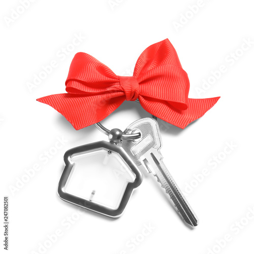 © New Africa, Fototapeta premium House key with trinket and bow on white background