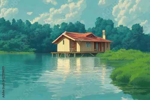 Naklejka premium House near a lake. Calm, peaceful wooden house in nature. Beautiful digital...