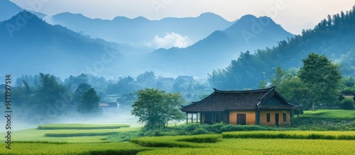 © indirah, Naklejka premium House on Farmland in Mountainous Landscape with Trees