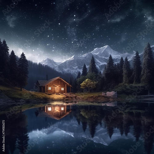 © qalandararts, Fototapeta premium house on the lake in mountains night scene