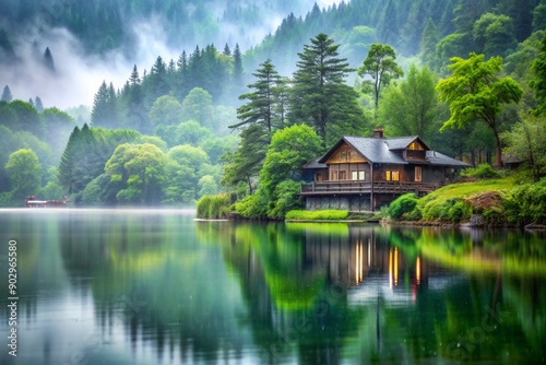 © Anastasiia Kasina, Fototapeta premium House on the lake in rainy day