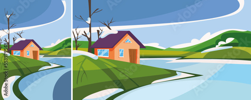 Fototapeta premium House on the lake in spring season. Nature landscape in different formats.