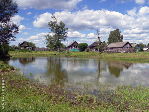 © Михаил Осюхин, Fototapeta premium House on the river Bank on a Sunny day