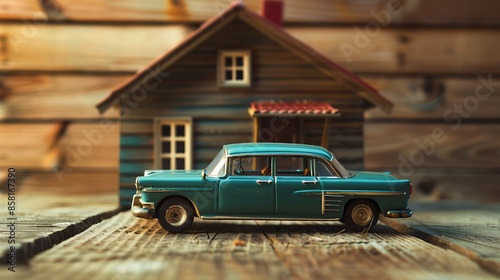 Fototapeta premium House on wooden background with retro toy car very detailed and realistic shape