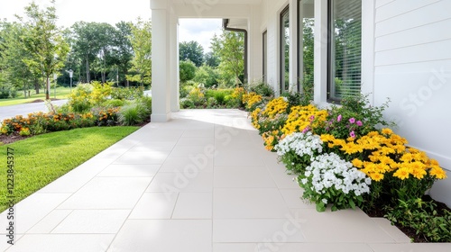 Naklejka premium House porch, flowerbeds, summer landscaping, sunny day, real estate