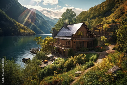 © SavirinaArt, Fototapeta premium House roof solar panel Generative ai. Eco-friendly home solar panels sustainability created.