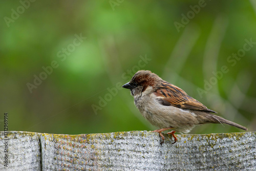© DesignToonsy, Naklejka premium House sparrow, male, Passer domesticus, perching on a old corrugated asbestos fence. Side view