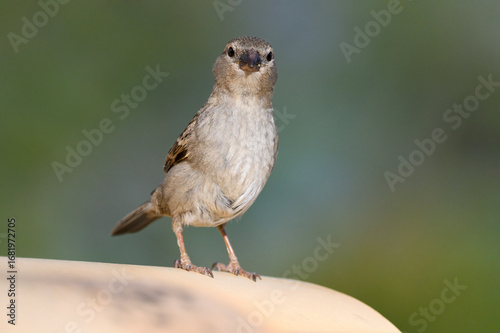 © David, Naklejka premium House Sparrow, Passer domesticus, adult female on tiled rooftop near to nest site. Mallorca, Spain
