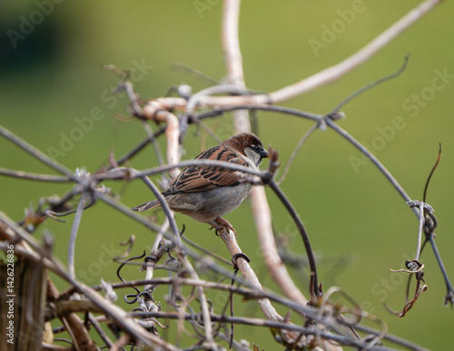© Alexander, Fototapeta premium House Sparrow Perched on a Vine Branch in Spring