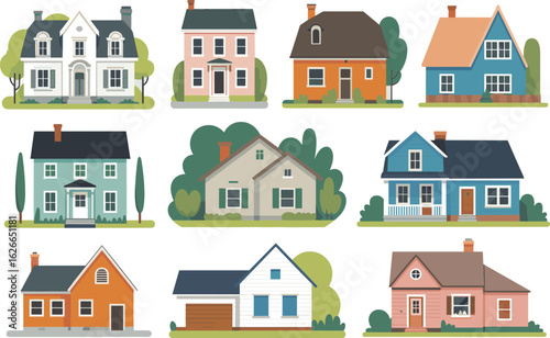 Fototapeta premium House vector set, colorful home illustrations, architectural styles pack, residential building icons, modern and classic houses, real estate design element