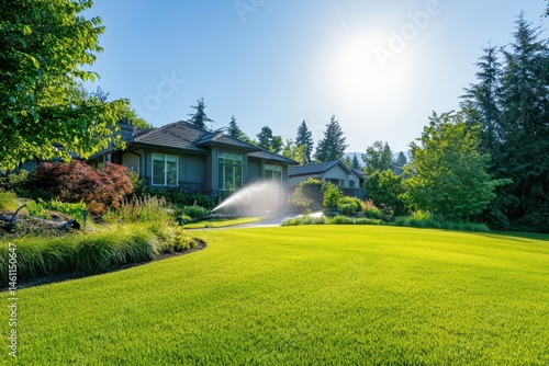 © EUT, Naklejka premium House with bright green lawn being watered by a sprinkler system. Perfect for real estate, landscaping, or home improvement needs.