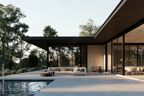 © schmidt, Obraz premium House with garden swimming pool and wooden deck