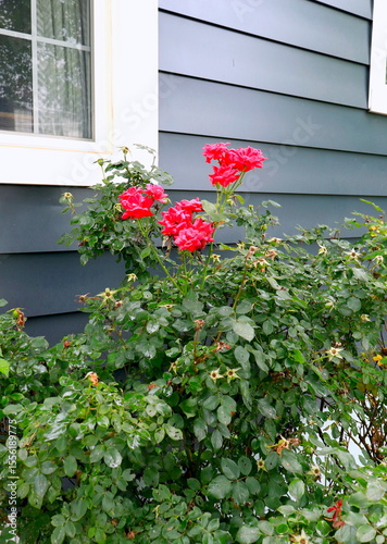 © Loraine, Naklejka premium House with Grey Siding and Rosebush
