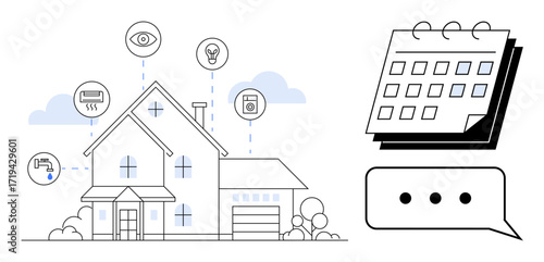 Fototapeta premium House with icons for monitoring and automation, calendar, speech bubble. Ideal for technology, smart living, scheduling, IoT, energy management, security simple flat metaphor