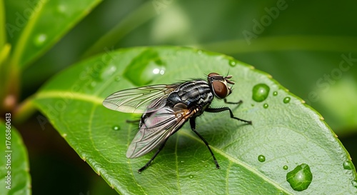 © Miya, Fototapeta premium Housefly on Dewy Leaf Closeup.