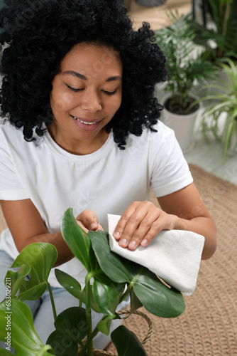© New Africa, Obraz premium Houseplant care. Woman wiping beautiful monstera leaves indoors