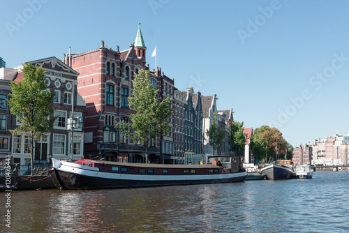Fototapeta premium Houses and barges on the river Amstel in Amsterdam