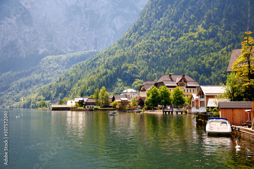 © Мария Аввакумова, Naklejka premium Houses and pier on the shore of the lake. Mountains with forest in the background. Boats and catamarans on the lake.