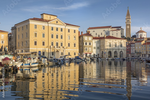 Naklejka premium Houses in Piran and their reflections, Slovenia