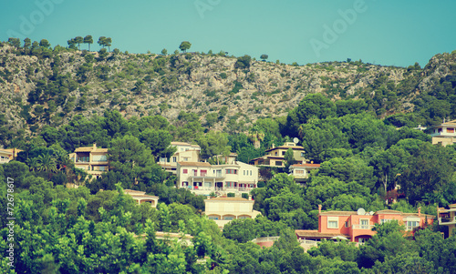 Fototapeta premium Houses in the green mountain hills.