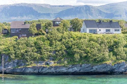 © hal_pand_108, Fototapeta premium houses on green shore, Bronnoysund, Norway