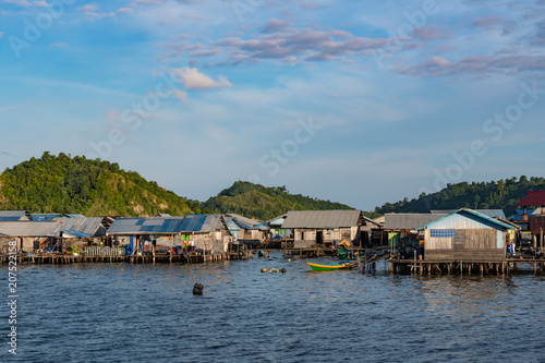 © Subphoto, Naklejka premium houses on stilts in Yellu village at sunset, east Misool, Indonesia