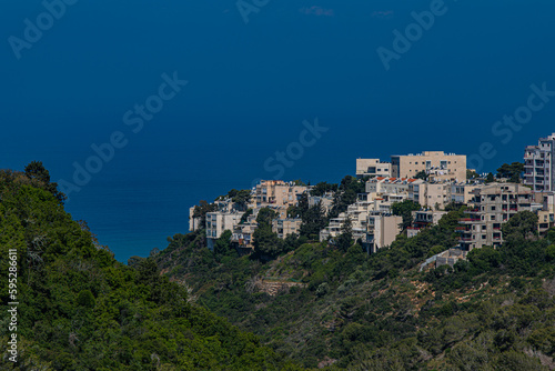 Fototapeta premium Houses on the mountain and the sea on the horizon