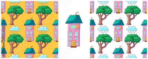 © bubushonok, Fototapeta premium Houses. Set city seamless patterns. Pattern in hand draw style