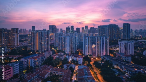 © Jorda, Fototapeta premium Housing costs reflected in a vibrant urban skyline at dusk. Featuring innovation and inclusivity