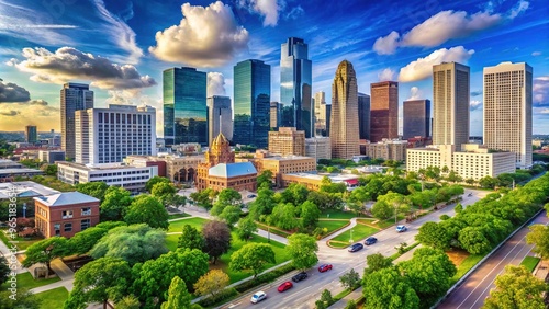 Fototapeta premium Houston's cityscape combines sleek modern skyscrapers with historic landmarks, set amidst a tapestry of lush green spaces and a brilliant blue Texas sky.