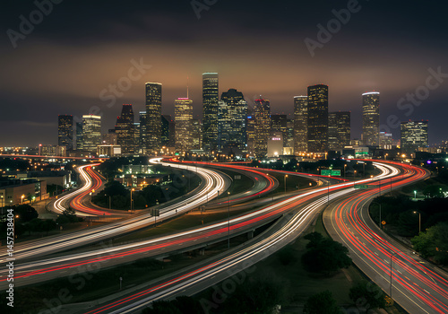 © Ozz, Fototapeta premium Houston's impressive skyline shimmers at night, with streaks of light from car trails below.