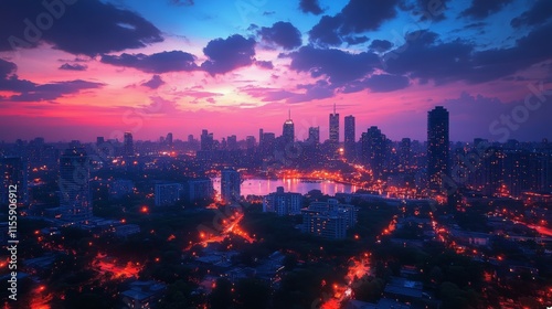 Fototapeta premium Houston skyline illuminated at dusk with glowing city lights and vibrant colors