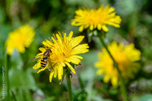 Fototapeta premium Hoverfly collects nectar on dandelion flowers