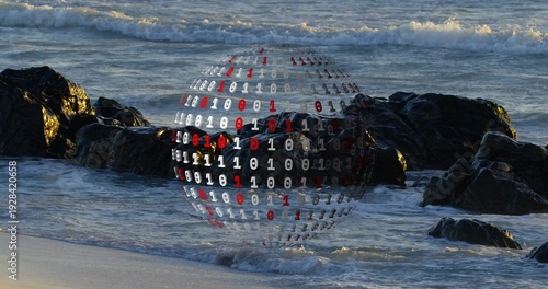 © vectorfusionart, Fototapeta premium Hovering binary sphere showing white and red digits above beach rocks, wet sand and breaking waves
