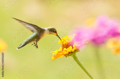 © pimmimemom, Obraz premium Hovering Hummingbird eating nectar from a Zinnia flower