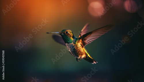 Fototapeta premium Hovering hummingbird flaps iridescent wings mid air generated by AI