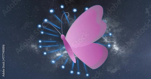 Fototapeta premium Hovering stylized pink butterfly graphic floating in outer space, with radial glowing blue nodes