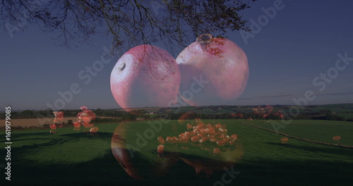 Naklejka premium Hovering two translucent red fruits above pasture under bare branches...