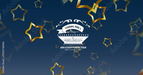 Fototapeta premium Hovering white banner with flourishes and ribbons over blue gradient, with metallic gold stars