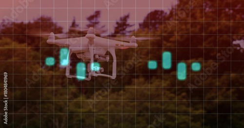 © vectorfusionart, Fototapeta premium Hovering white quadcopter showing gimbal and four propellers over tree line, teal HUD grid